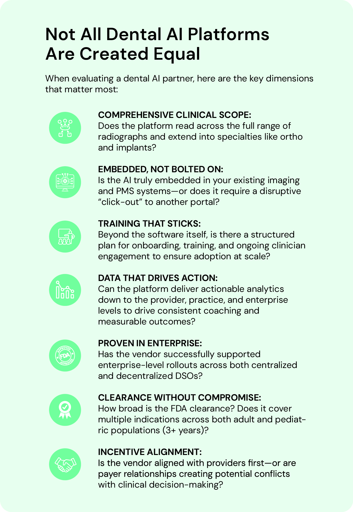 As practices explore AI solutions, it’s clear that not all platforms are created equal. The most effective tools are FDA-cleared, clinically validated, and built to meet the highest standards of compliance and data privacy. They are seamlessly integrated into existing workflows and designed with patient trust in mind. They provide intuitive visuals for communication, robust reporting at every level, and proven scalability across enterprise DSOs.