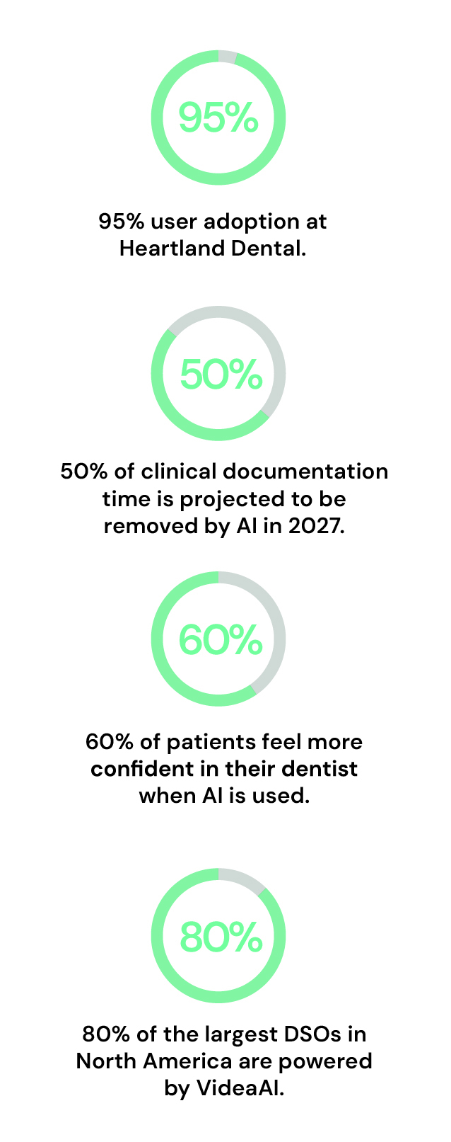 Heartland Dental, the largest DSO in the U.S., became the proving ground for AI at scale. Within weeks, the platform was not only rolled out but also embraced. With adoption across nearly every supported practice, VideaAI quickly became part of the clinical workflow rather than an added step.