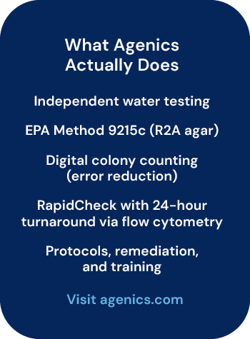 Agenics’ services begin with water testing but extend through comprehensive support, including protocol development, failure remediation, and extensive training. Bacteria testing is most commonly performed via the gold standard EPA Method 9215c using Reasoner’s 2A (R2A) agar—a venerable approach particularly effective at growing the bacteria common in dental waterlines. We’ve branded this our StandardCheck service, and it is a reliable baseline for whether a practice meets the basic EPA standard for drinking water.